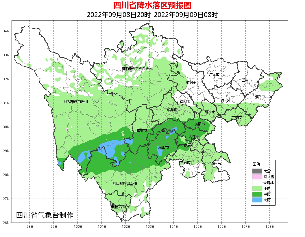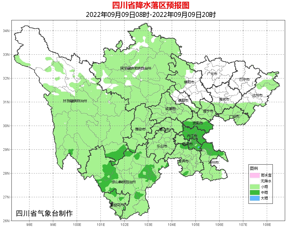 广元、绵阳、巴中、达州4市阴转多云,盆地其余各市阴天有阵雨或者雷雨,其中雅安、眉山、乐山、资阳、内江、自贡、泸州7市有中雨,局部大雨;川西高原大部和攀西地区阴天间多云有阵雨或雷雨,其中甘孜州南部和凉山州北部有中到大雨。