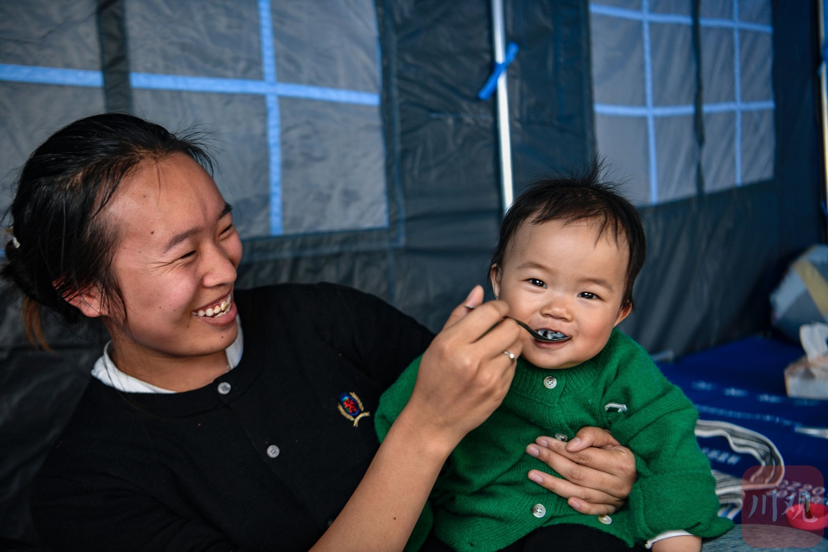 周静是得妥镇北头村村民,地震发生后,家里房屋受损,她带儿子宇宇来到泸定二中安置点,“第一天吃的方便面,从第二天开始,就有热饭热菜了。”周静说,“到这里四天了,现在生活上什么都不缺。”
