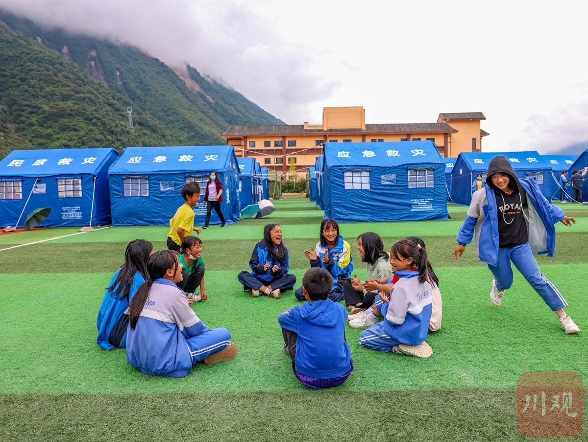 “丢手绢,丢手绢,轻轻地丢在小朋友的后面......”9月8日上午,记者走进海螺沟教育园区安置点,一顶顶救灾帐篷整齐排列,小朋友们有的在帐篷内轻声阅读书籍,有的三五成群做着游戏,歌声回荡在山沟沟里。