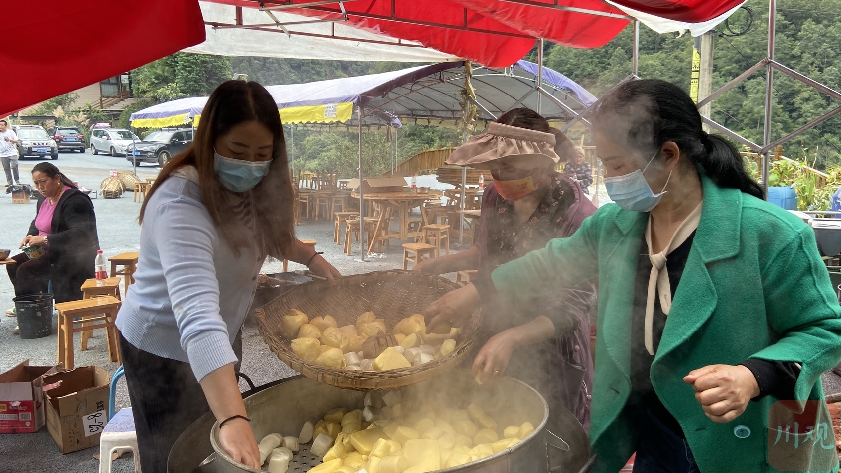 9月8日11时40分,经过近三个小时的山间徒步,四川在线记者来到了距离磨西镇10公里外的柏秧坪村最大的安置点。此处安置点虽只有3间帐篷,但是现场搭着简易大棚,大棚内黄色的木质桌椅板凳齐全,2口油桶改造的炉灶上,大锅冒着热气,刚蒸熟的热馒头软和,散发着香味。
