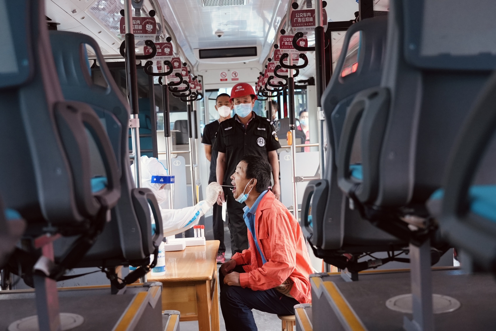 这是成都公交集团的首批“核酸检测流动服务车”,通过“流动+扫街”的方式提供核酸检测服务。当天上午,这辆公交车先后停靠蔡桥街道光华里小区、成都市第六幼儿园、四川设计产业园、污水处理厂第八厂、中建八局工棚区等五个点位。“今天还有多个街道主动联系我们,提出‘流动核酸采样车’需求,我们后续也会根据需要,增加服务车辆和点位。”