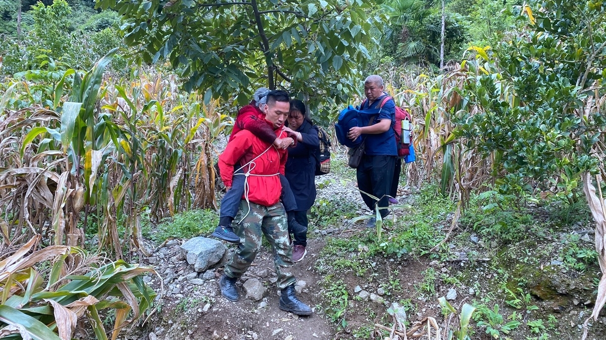 坐车、走路,80余名群众分为3批,走过抢通2公里的“坦途”大道,来到了救援人员从荆棘烂石滑坡处开辟出的羊肠小道。雨后的小道令人望而生怯,对于老年人来说,无从下脚。“10多位老人,本来就行动不便,走小路几乎不可能。”转移的村民不禁愁容满面。
