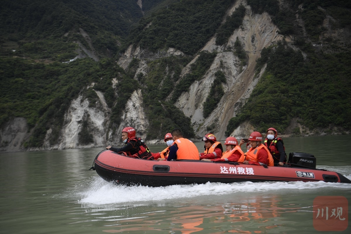 救援队伍乘橡皮艇挺进湾东村。 杨树 摄