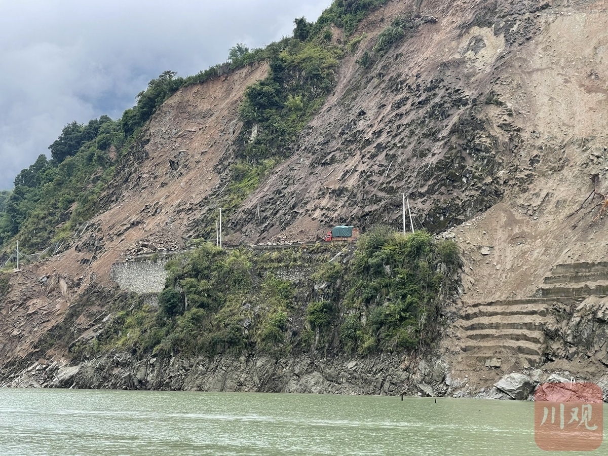 船行大渡河,向下游驶去,四川在线记者看到,沿岸的山坡,不时有石块滚落到江中,溅起水花。通过联合村隧道后,岸边的省道217线多处被垮塌的山体掩埋,有车辆被困在断道中。
