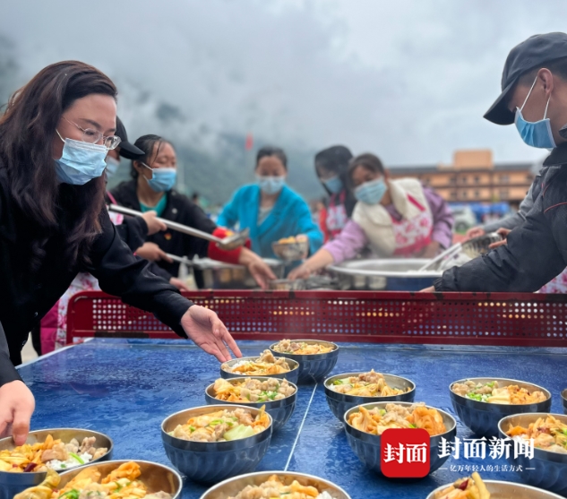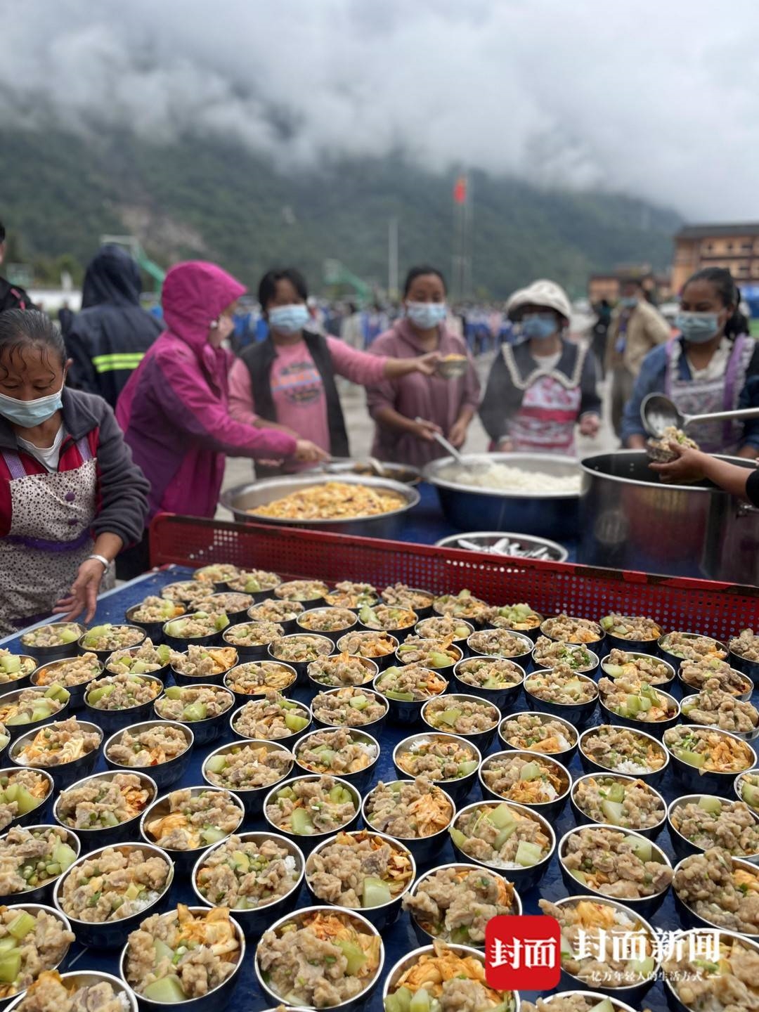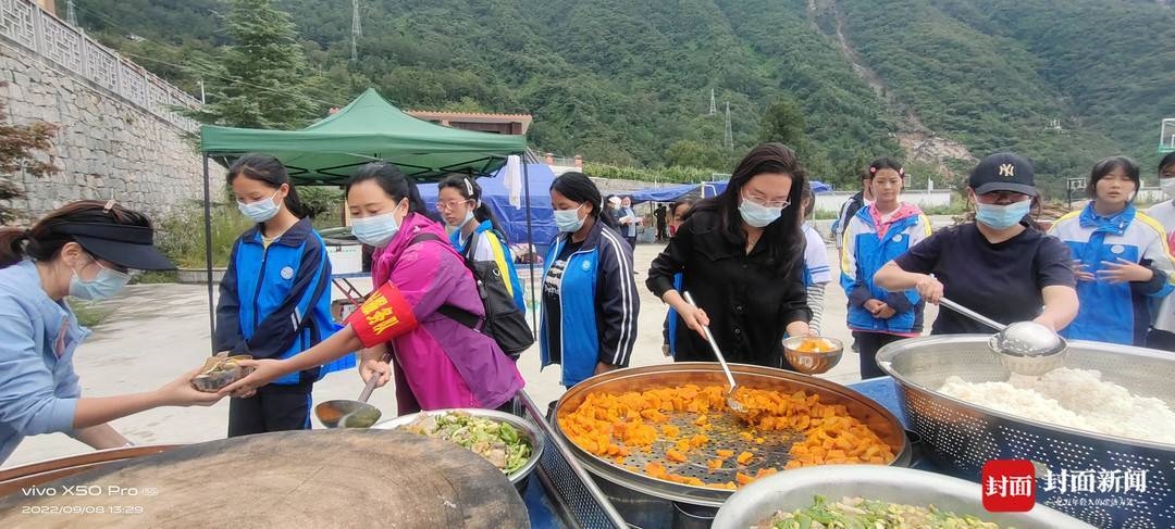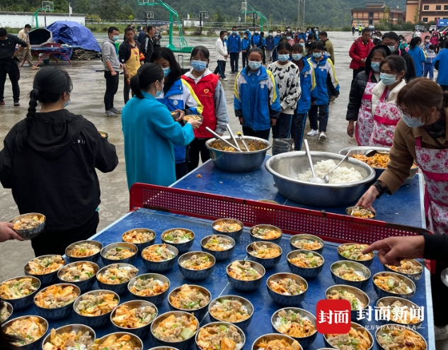 “地震发生以来,我们组织搭建了5口大铁锅,每顿能够供应300人。除了从学校食堂“抢救”出的物资,政府、部分爱心人士和家长捐赠的物资每天也会陆续送达。现在我们的早餐有鸡蛋、牛奶,午餐一荤一素,在保证食品安全的前提下注重营养。”海螺沟中学副校长王平介绍。