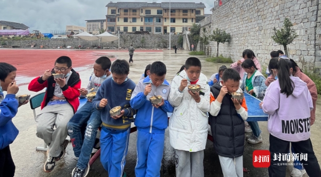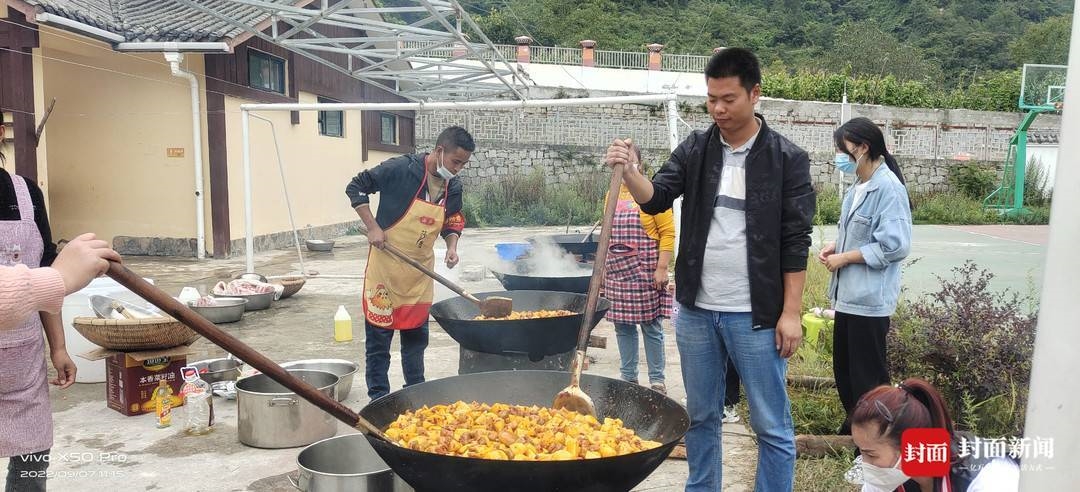 “我进去抱了一袋米。后来做饭时发现盐巴不够,老师们又回食堂抢盐巴。”杨小军说,“第一天要困难一点,晚上7点过才开饭,后面就很简单了。政府、企业和我们自筹的物资源源不断送来,前两天老师们捐的腊肉,用青椒炒出来,好多娃娃都说好吃……”