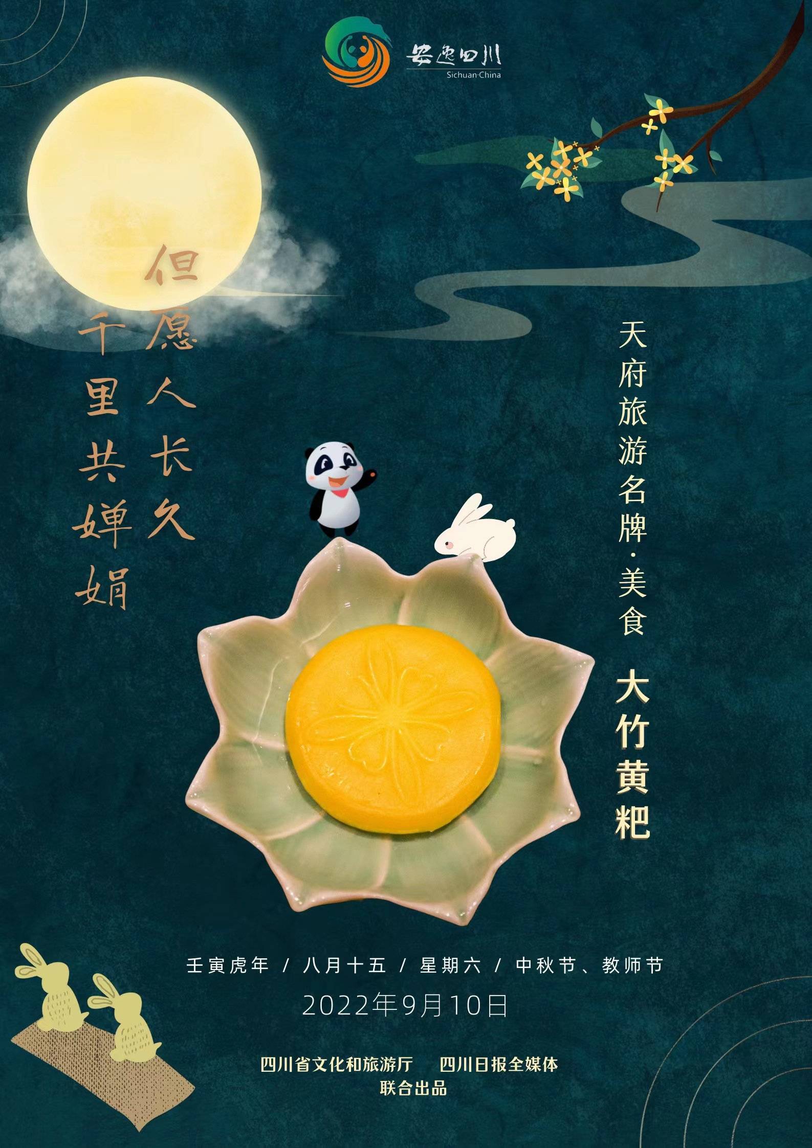9月10日,农历八月十五,今天是传统中秋节,也是教师节。双节同至,今日天府旅游名牌日历海报推出天府旅游美食之大竹黄粑,其“形如满月”、味美香甜,是大竹等地区在传统佳节之时食用的传统点心。