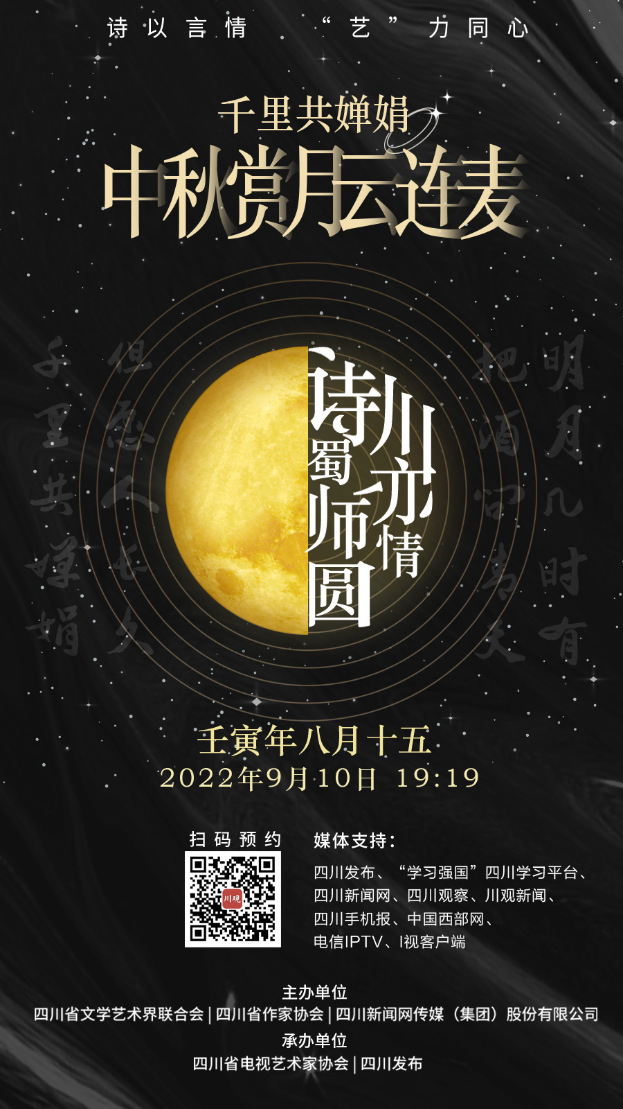9月10日是中华民族的传统佳节中秋节,由四川省文学艺术界联合会、四川省作家协会等联合主办的“千里共婵娟——中秋赏月云连麦”活动,将于当天19:19在全网推出,川观新闻“艺数平台”同步播出。
