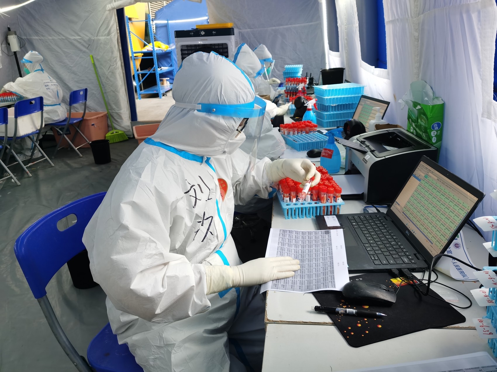 身处疫情防控一线的四川省人民医院气膜方舱实验室内,前处理组第三组组长、省妇幼保健院生殖医学中心副主任技师刘玖和小组成员已完成了2万个核酸样本的前处理。“一进舱,七八个小时,不吃不喝不上厕所,是我们的常态。”