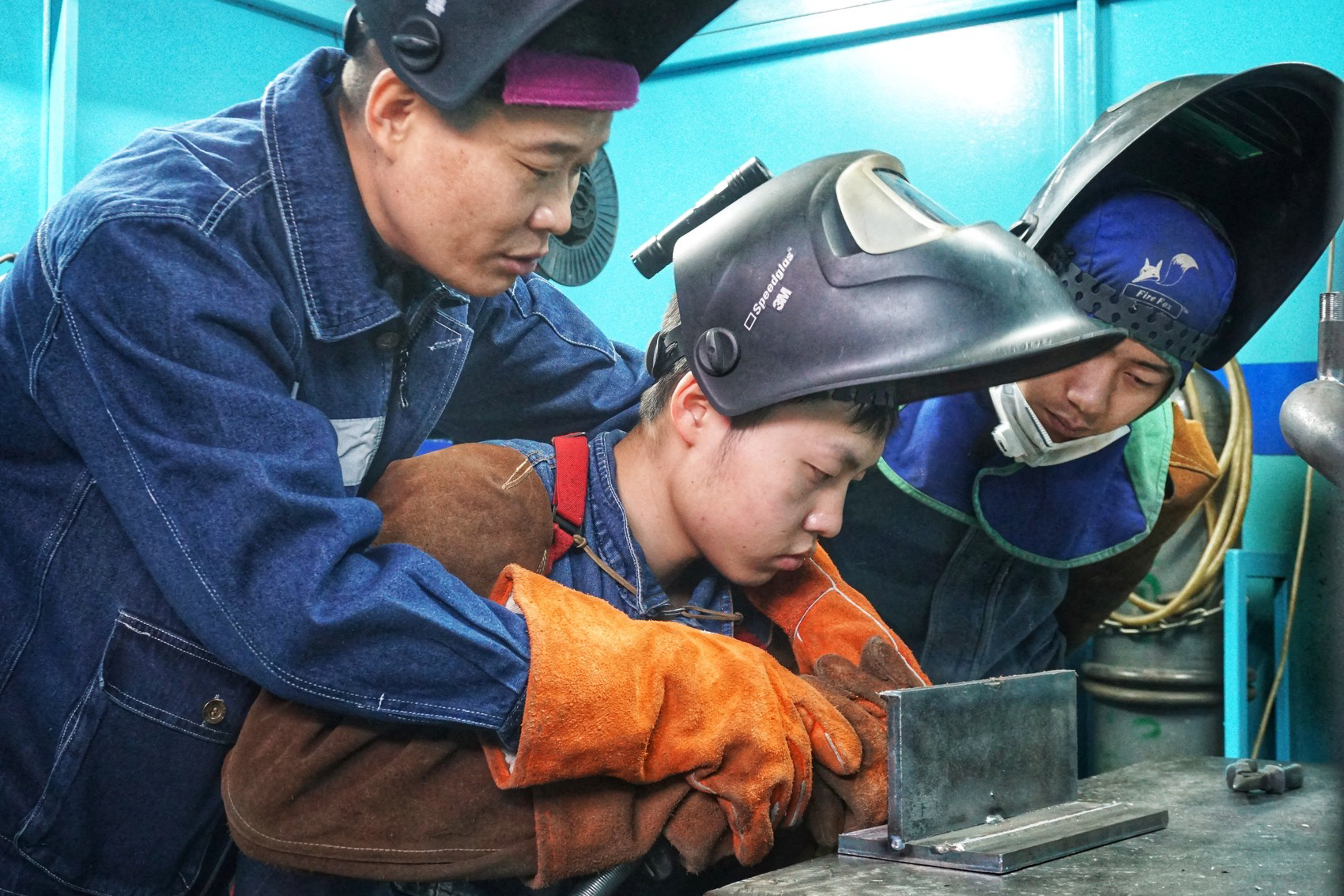 周树春手把手指导学生学习焊接技术。(图/陈姝妤)