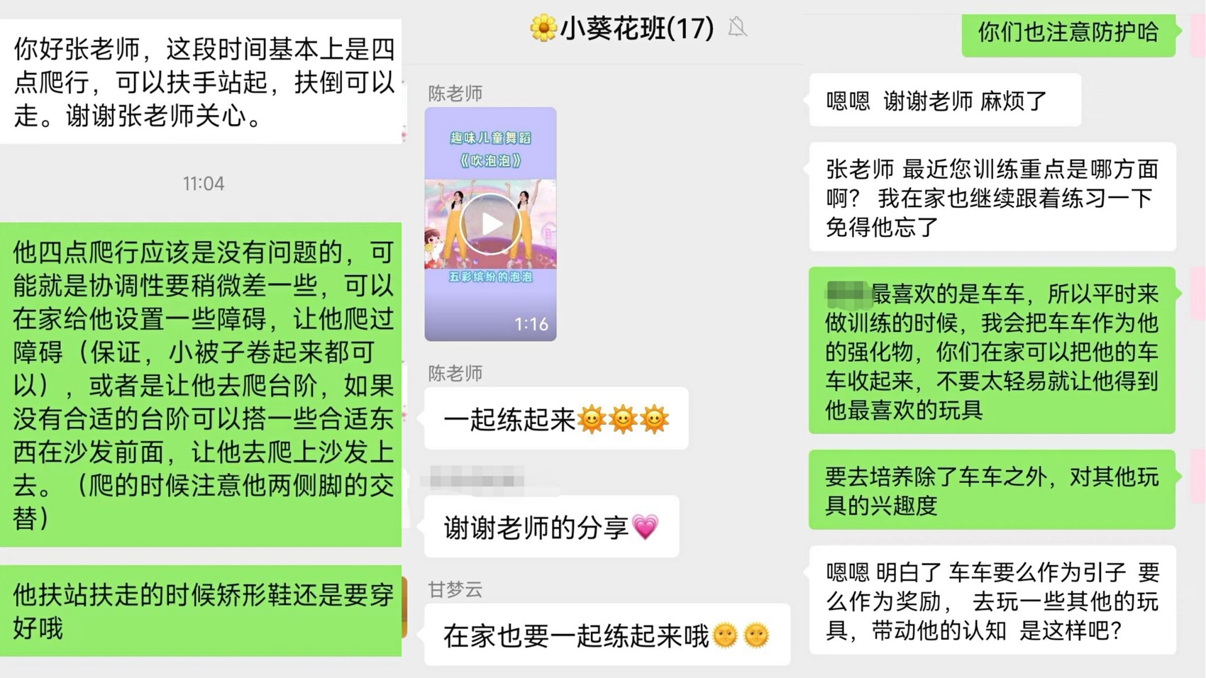 线上康复指导计划一经推出,家长们或是把自己在家庭康复中遇到的困难与老师进行沟通与讨论,或是把家庭康复训练的视频与治疗师分享,有问有答,及时的沟通保障着孩子的康复训练。