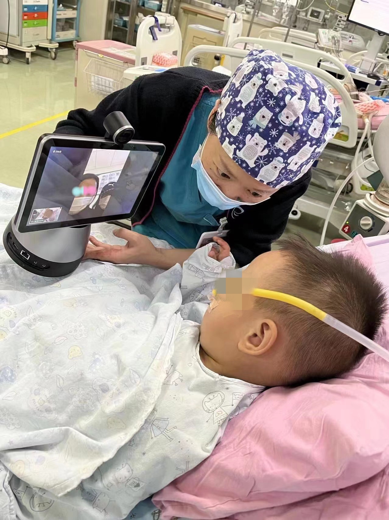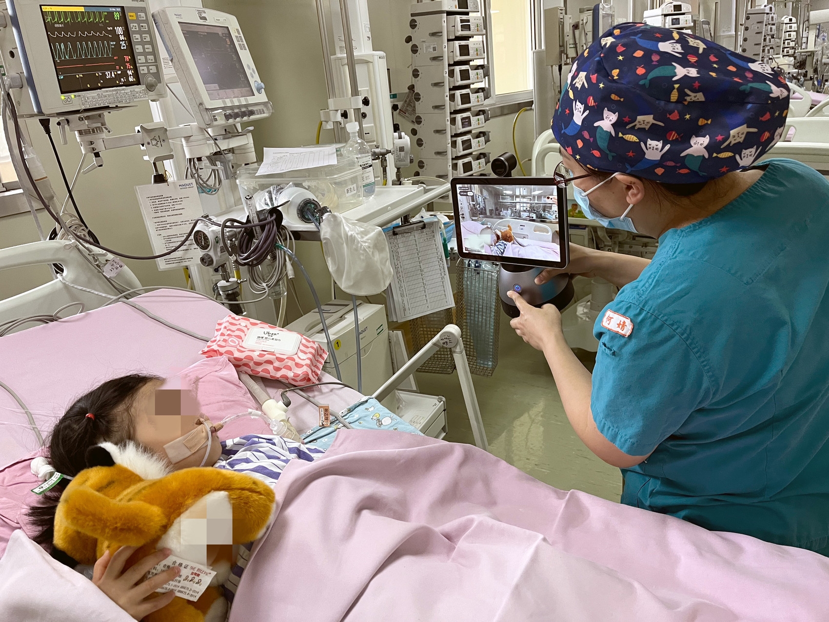 儿童重症医学科,医护人员正在用“移动探视终端”与孩子父母沟通。四川省妇幼保健院供图