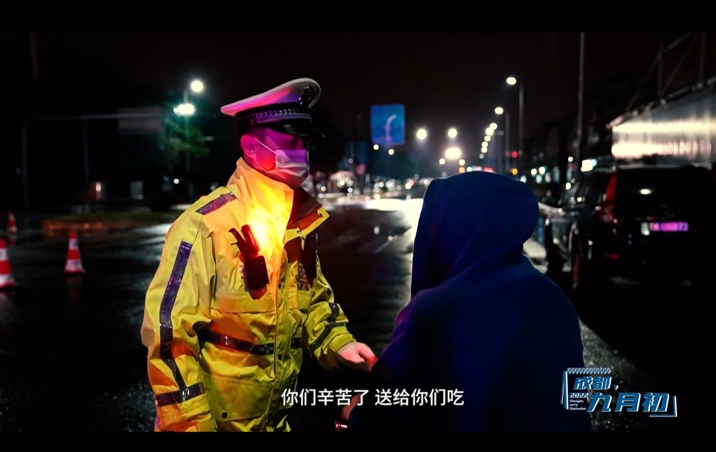9月3日凌晨,摄制小组来到成都市双流区川大路,成都交警十二分局的一线工作者就这样跃入镜头。川大路靠近成都双流西航港成都农产品中心批发市场。作为成都的“菜篮子”,这里是农产品保供的重要点位,承担成都市主城区80%以上的大宗生鲜农产品供应,牵动着成都人的心。一夜未眠,摄制组打捞着这条路的鲜活故事。雨夜,给成都农产品批发市场供应的车辆却未有停歇。忙碌的交警一边忙着核查通行证,一边不忘叮嘱过往车辆控制好车速。黑夜中,有市民担心交警们忙于工作没时间购菜,他们冒雨而来,为交警们送上蔬菜。婉拒了这一好意,成都交警十二分局二中队副中队长司韵心里却很暖,城市的温度,就在这个雨夜,悄悄融满在镜头里。
