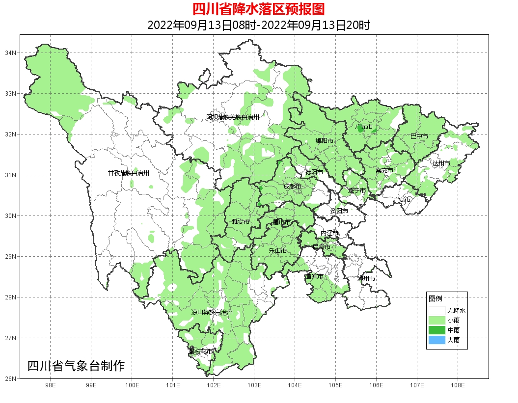 根据四川气象的消息,今日20时至明日20时,盆地各市多云间阴天,有分散阵雨,其中广元局部有中雨;甘孜州西北部、东南部和阿坝州东部以及攀西地区多云间阴天有分散阵雨或雷雨,川西高原其余地方多云间晴。↓↓↓