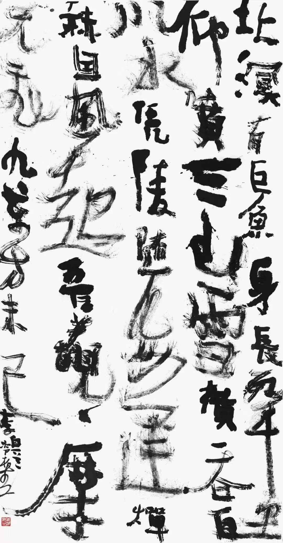 “浩荡千樽酒,神州几棹歌。巨声轰彼岸,涓滴汇长河。壶口惊心悸,江山冠伟峨。韶华春色好,回首望清波。”著名书法家何开鑫以草书自作五言律诗《壶口述怀》参展。去年夏天,何开鑫赴黄河采风,站在壶口瀑布岸边,一股“黄河之水天上来”“万马奔腾冲向前”的感觉扑面而来。“她与我们中华民族生生不息、一往无前的内在品质太契合了,我被深深打动,由此创作了这首五律。”在书法上,《五律〈壶口述怀〉》主要采用了大草的形式,以对比、起伏,交叉裹挟的线条来表现壶口瀑布那种翻江倒海的图景。
