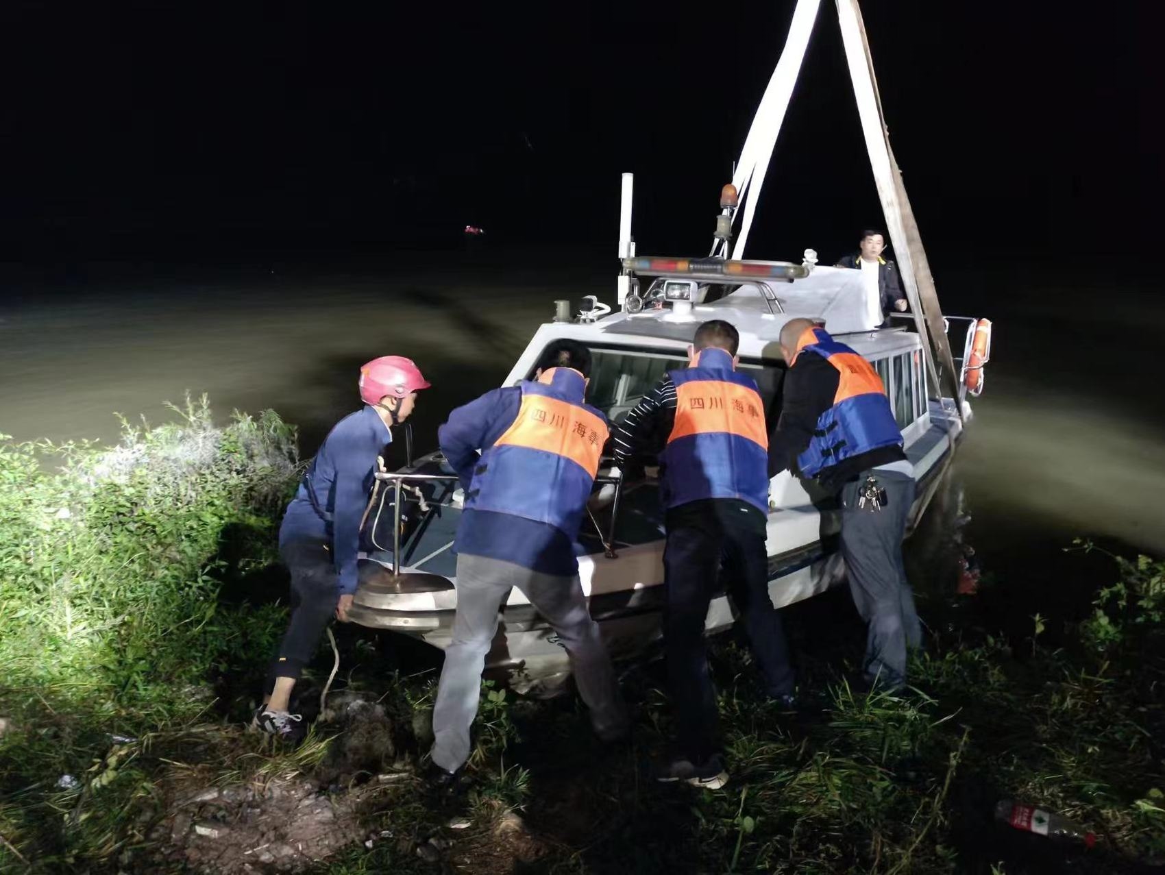 “马上下水!”张琦立马组织4艘船只编队。22时10分,穿着橙色衣服的消防队员登上第一艘下水的船。船启动了,可这段大渡河水域并未常年通航,没有航行夜标等指示标记,夜幕之下,难以辨别方向,船不是往上游,而是往对岸驶去。