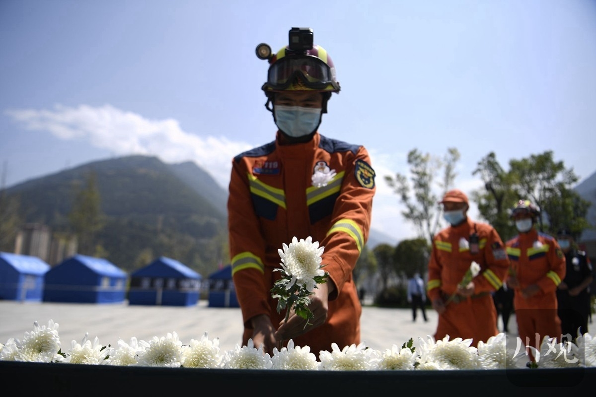 黑白条幅,白色菊花,磨西镇的默哀现场,海螺沟消防救援大队专职队长苏久贵发眼圈发红,有些哽咽。“我们发现一位遇难者,家属的哭泣声让我的心顿时被掏空。”他说,那些刻在脑海里的救援画面再一次浮现,让他不得平静。