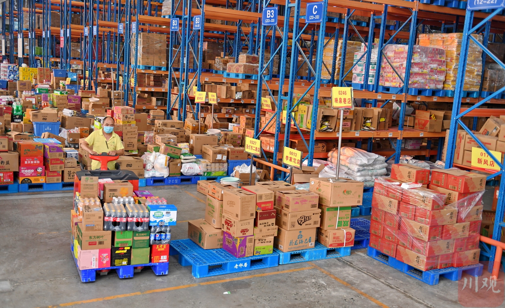 9月12日下午,在位于成都市温江区温泉大道三段的四川老邻居配送中心,转运员正在把商品转运到分店指定堆货区域。