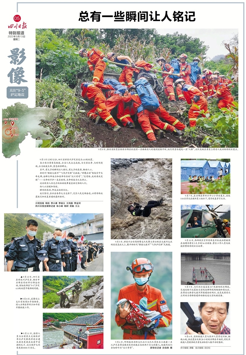 其中,有太多的瞬间让人铭记,有太多的表情触动人心。新时代“强渡大渡河”“飞夺泸定桥”式救援,“神鹰出动”架起空中生命走廊,诠释生命接力和使命传承的“汶川哥哥”,“没有路,我的肩就是路”……生命的守护一直在继续,生命的接力从未停止。