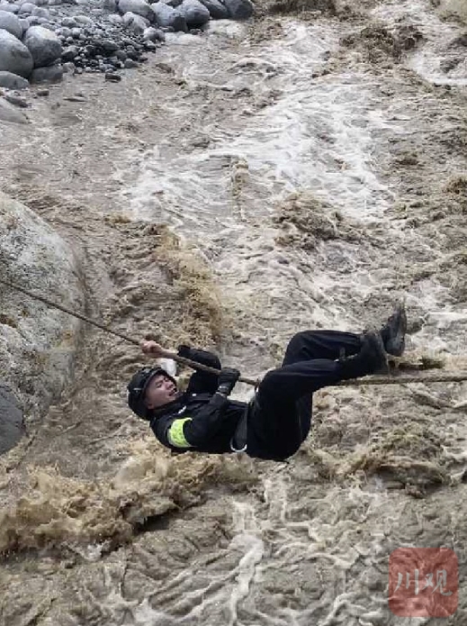 9月5日,甘孜州公安局特警支队民警土登汪秋在大渡河支流的滚滚急流之上,展开新时代“强渡大渡河”“飞夺泸定桥”式救援。