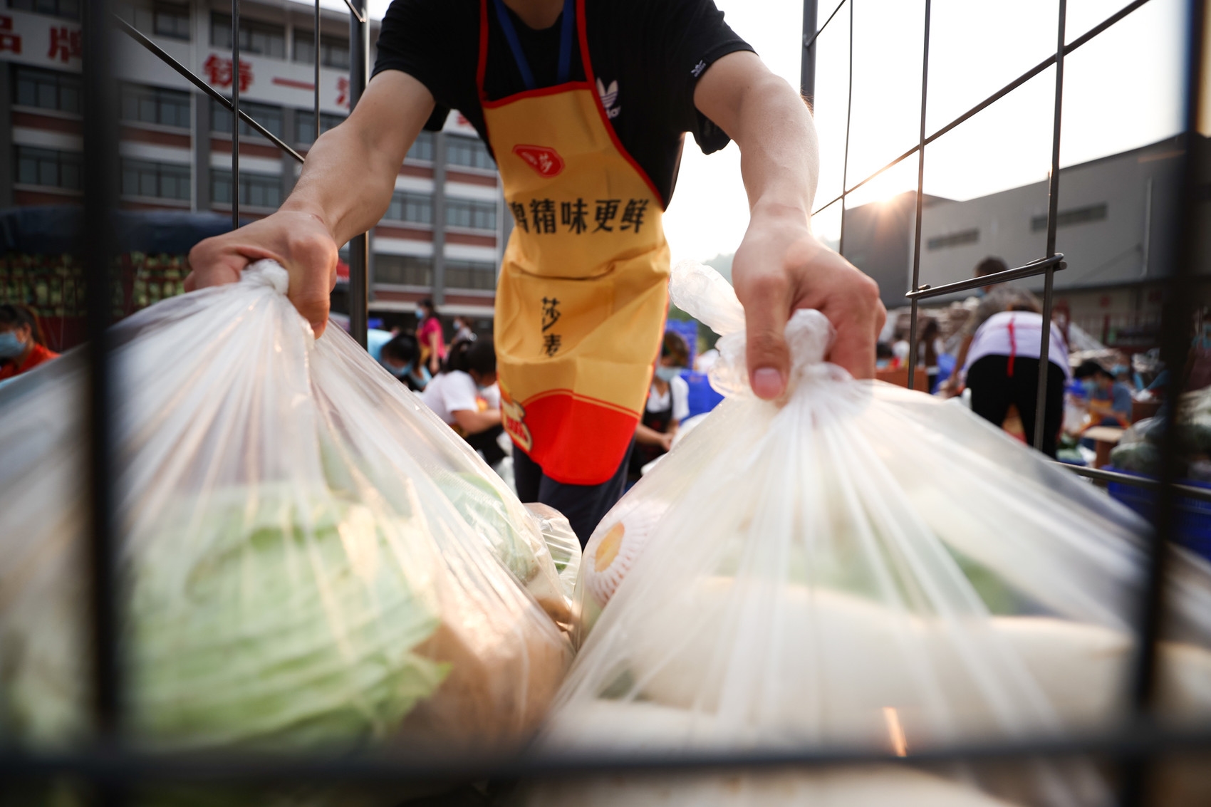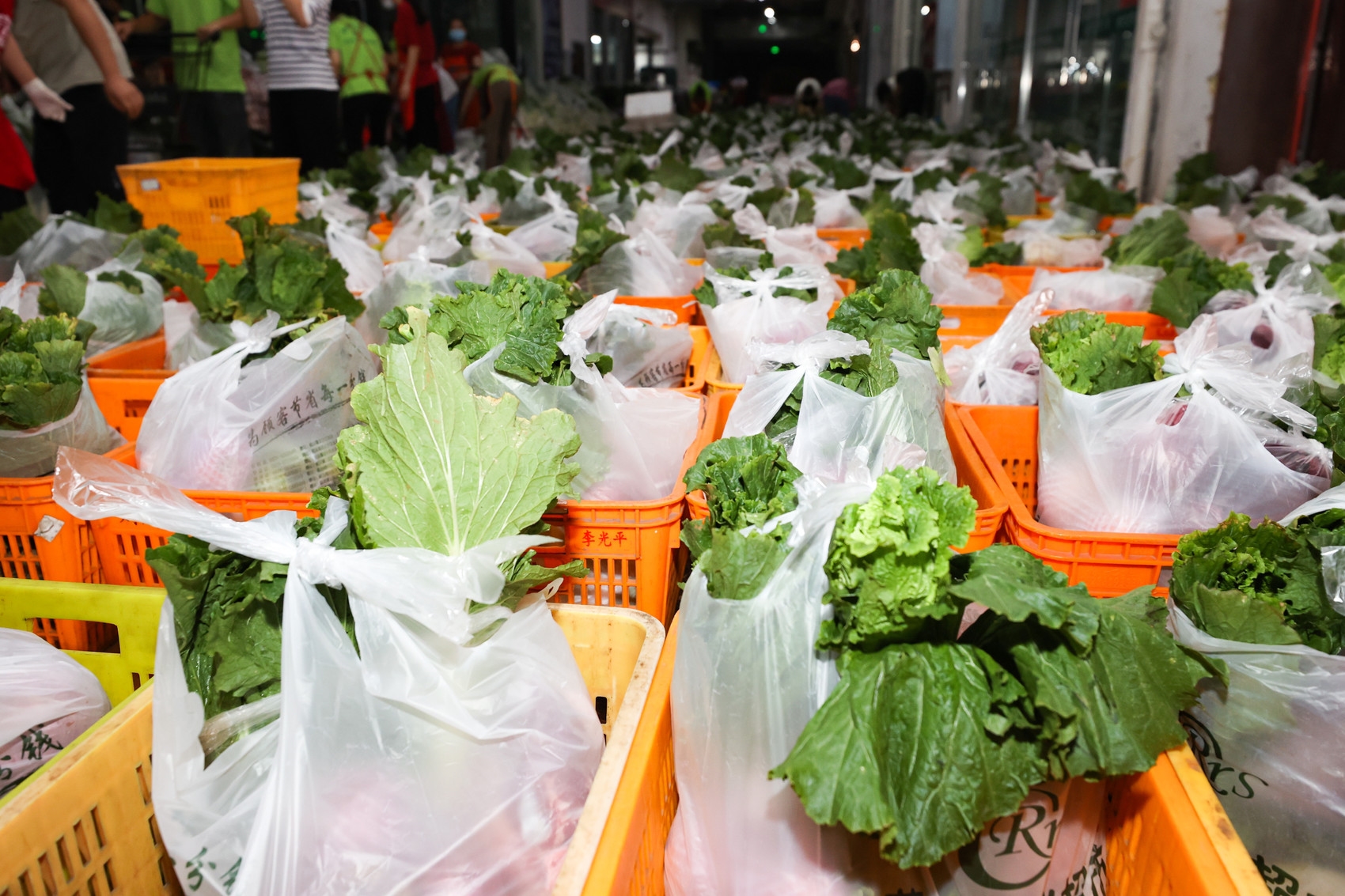 清晨6点,在象鼻街道的绿源超市物流基地,18000余份生活食品物资包正在快速打包中,装袋完毕后将被送往合江门街道的居民家中。