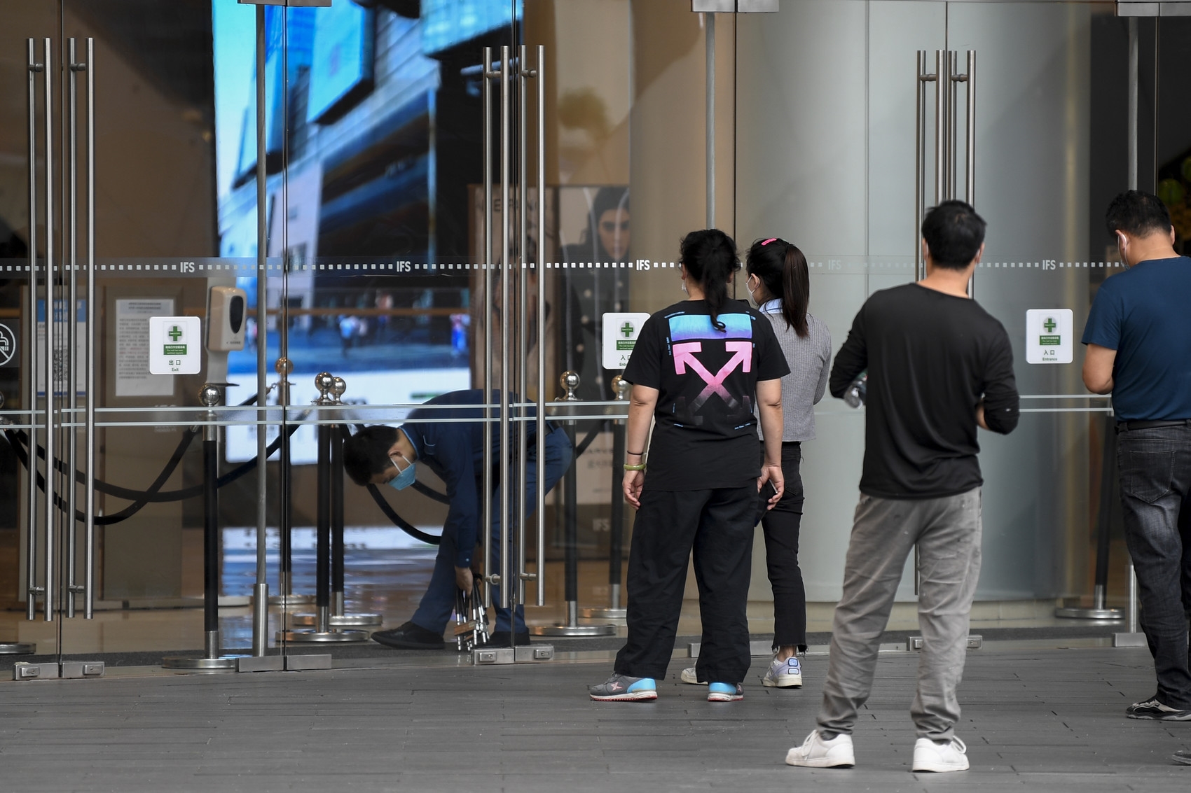 在IFS国金中心,工作人员正在打开门锁,门口的市民排队有序进入。