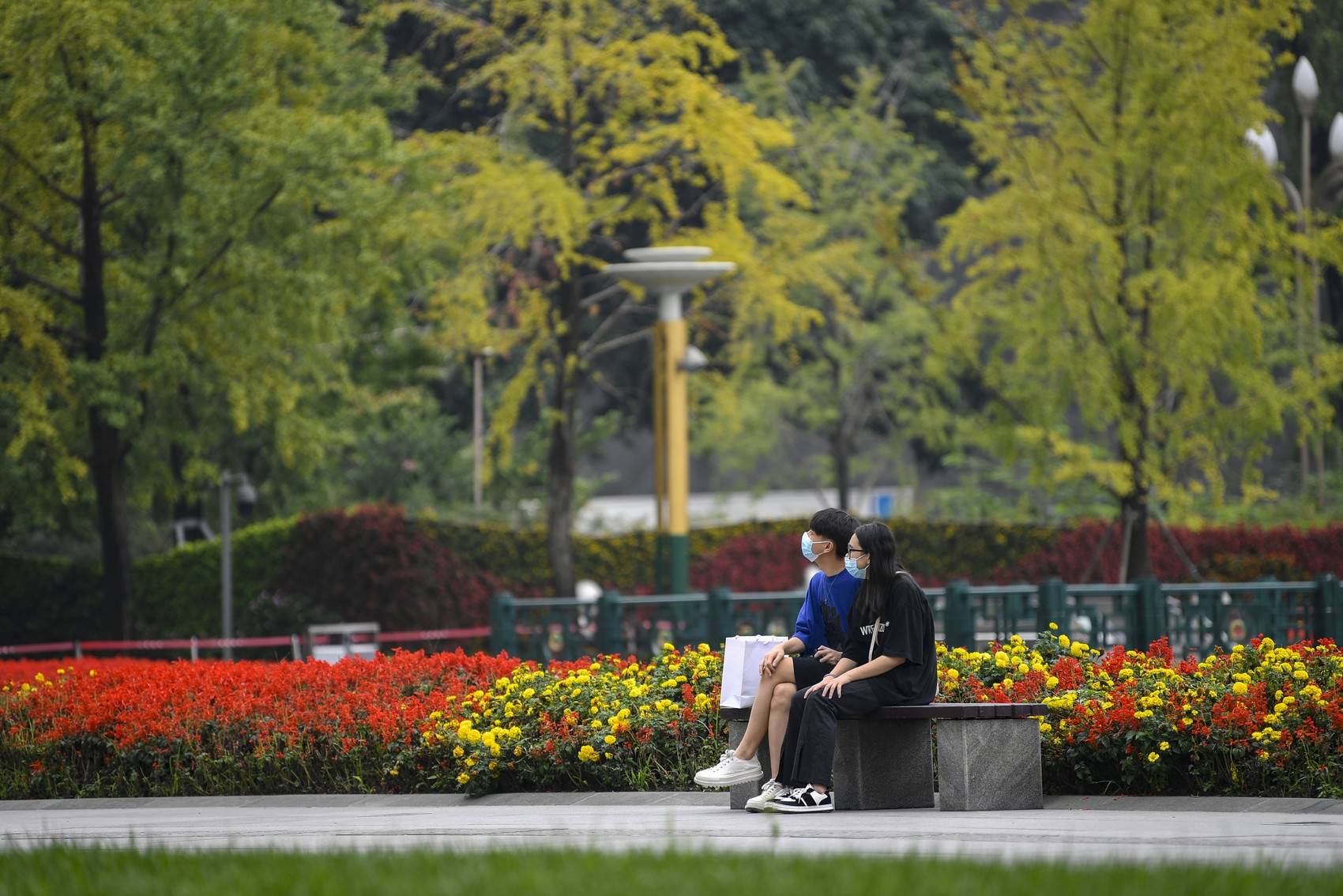 天府广场,市民坐在长椅上欣赏秋色。