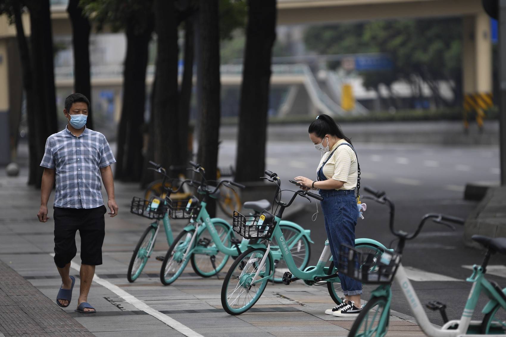 总府路上,市民扫码骑乘共享单车。
