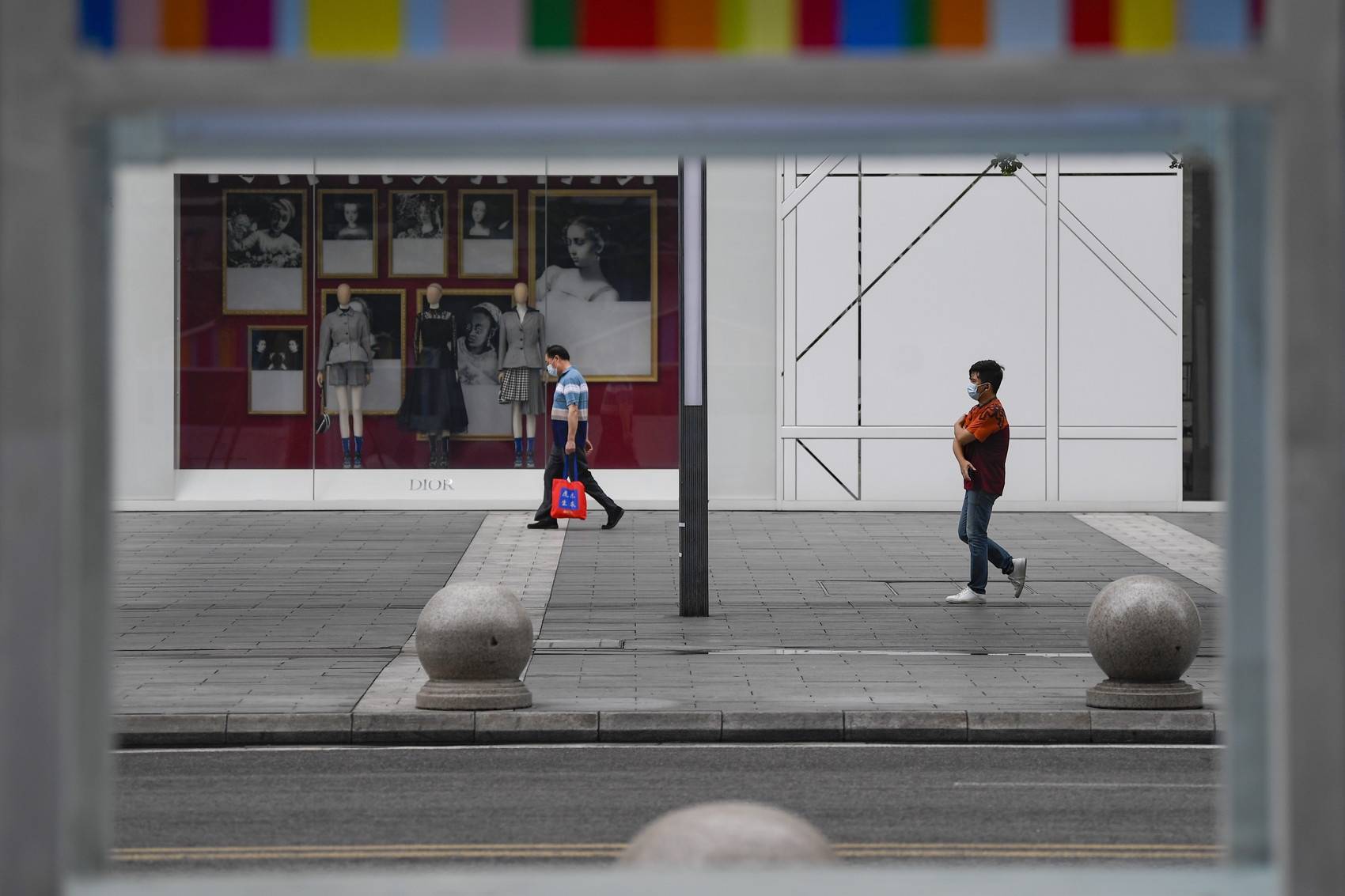 春熙路旁的天桥上,散步的市民感受慢慢恢复烟火气的街头。