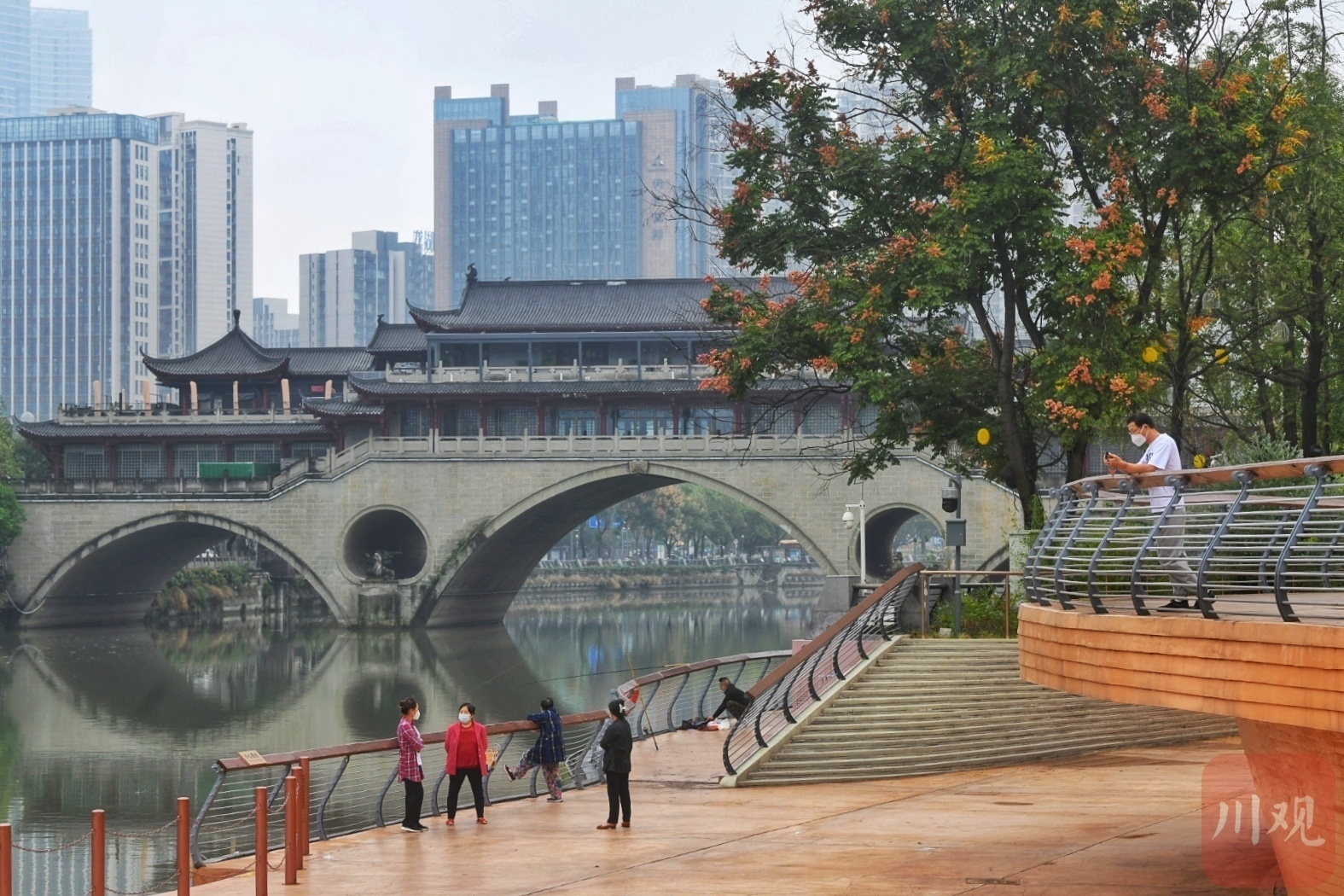 9月15日下午,几位成都市民在廊桥边休息。华小峰 摄
