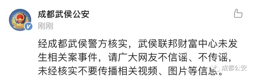 经成都武侯警方核实,武侯联邦财富中心未发生相关案事件,请广大网友不信谣、不传谣。