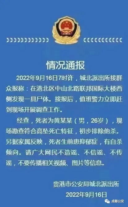 经查,死者为黄某某(男,26岁),现场勘查符合高坠死亡特征,初步排除他杀。另据家属反映,死者生前患抑郁症,有自杀倾向。请广大网民不造谣、不信谣、不传谣,不要传播相关视频、图片等信息。