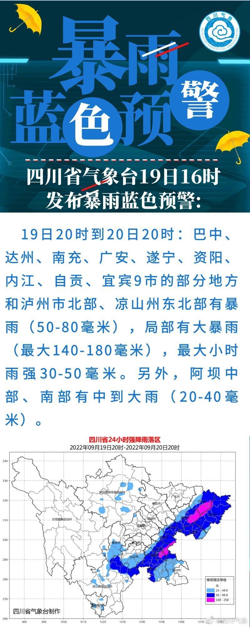 四川省气象台19日16时发布暴雨蓝色预警:19日20时到20日20时:巴中、达州、南充、广安、遂宁、资阳、内江、自贡、宜宾9市的部分地方和泸州市北部、凉山州东北部有暴雨(50-80毫米),局部有大暴雨(最大140-180毫米),最大小时雨强30-50毫米。另外,阿坝中部、南部有中到大雨(20-40毫米)。