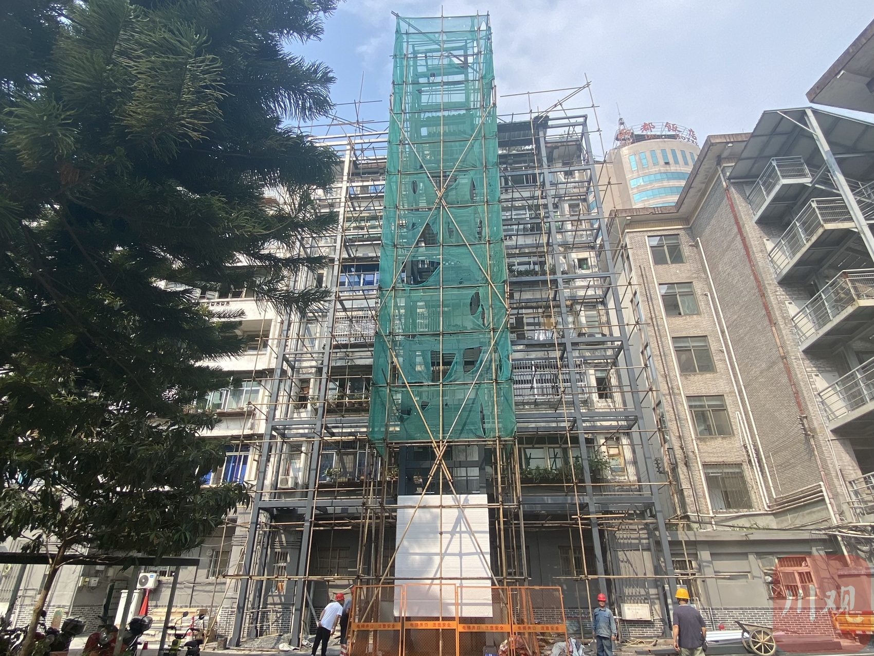 9月23日,雨城区南二路38号大院内正在进行电梯加装建设,脚手架已经架设完毕。“小区计划增设9台电梯,其中5台已建成投用。”拿着2022年雨城区增设电梯进度表,现场施工负责人说。