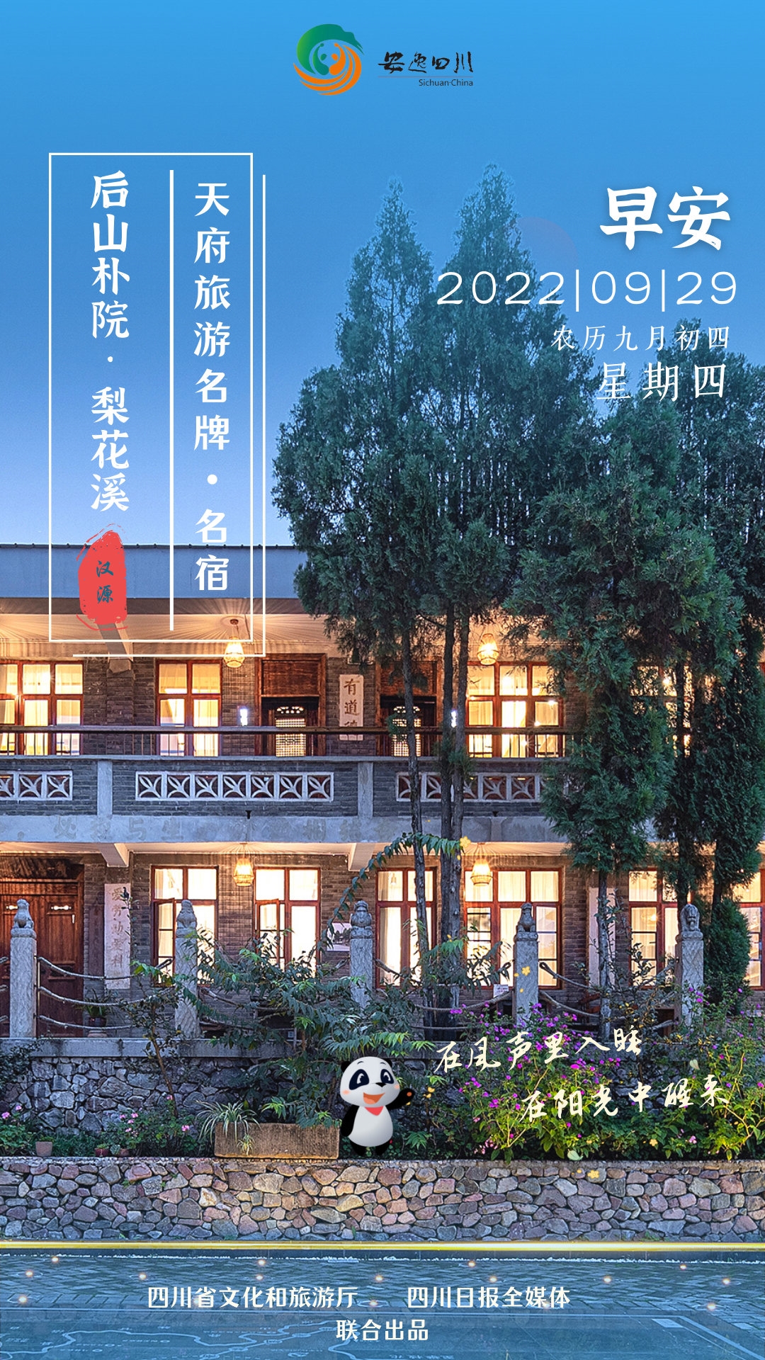 9月29日,星期四。今日天府旅游名牌日历海报推荐天府旅游名宿之汉源县后山朴院·梨花溪民宿。