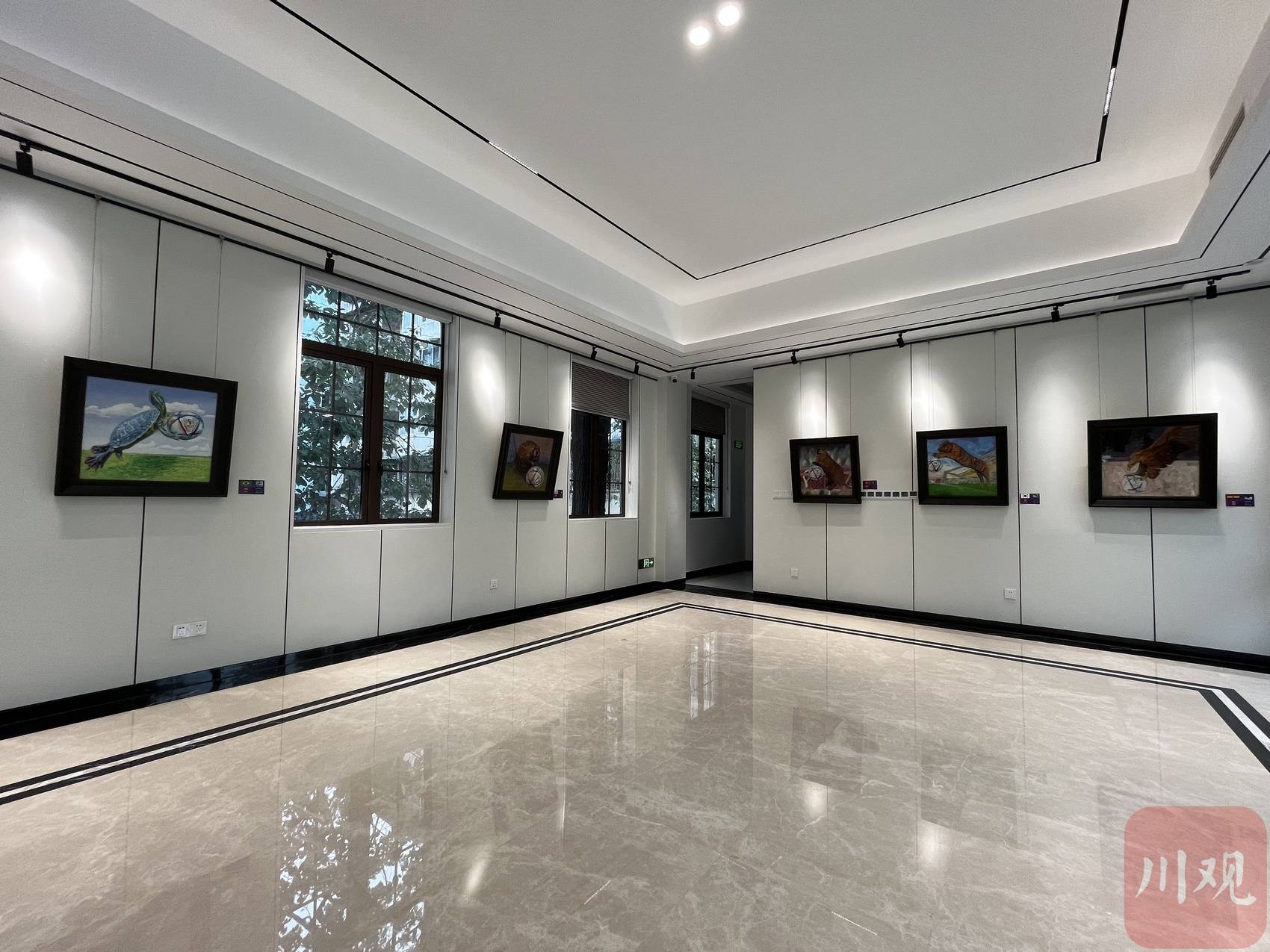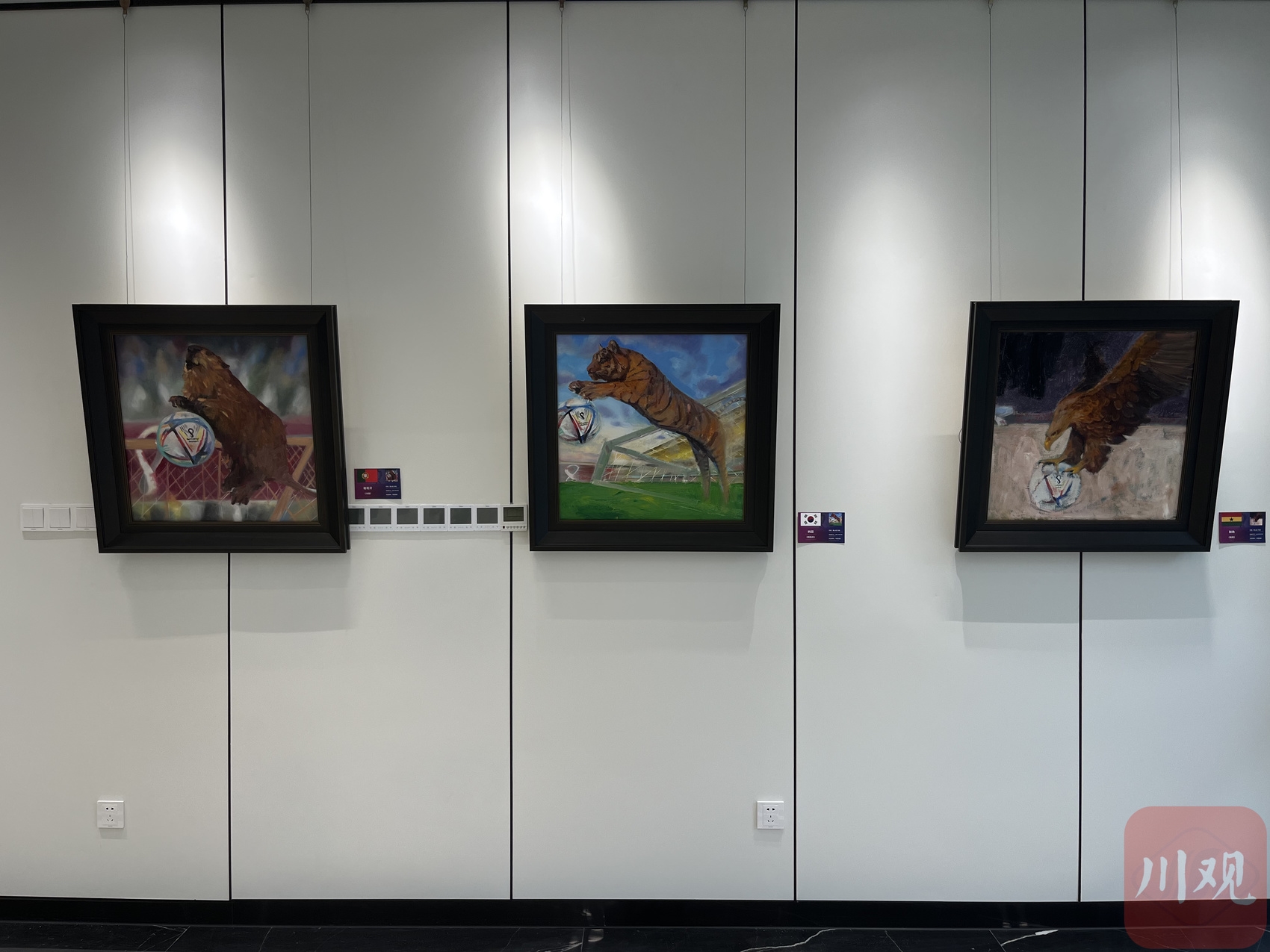 本次展出作品由四川心悦美术馆馆长魏心田女士和杨进先生创作。作品以布面油彩表现赛场的激情,将32个参赛国家和地区的代表性动物与足球元素相结合,用现实主义和浪漫主义相结合手法,融入中国画的写意色彩精心创作而成。