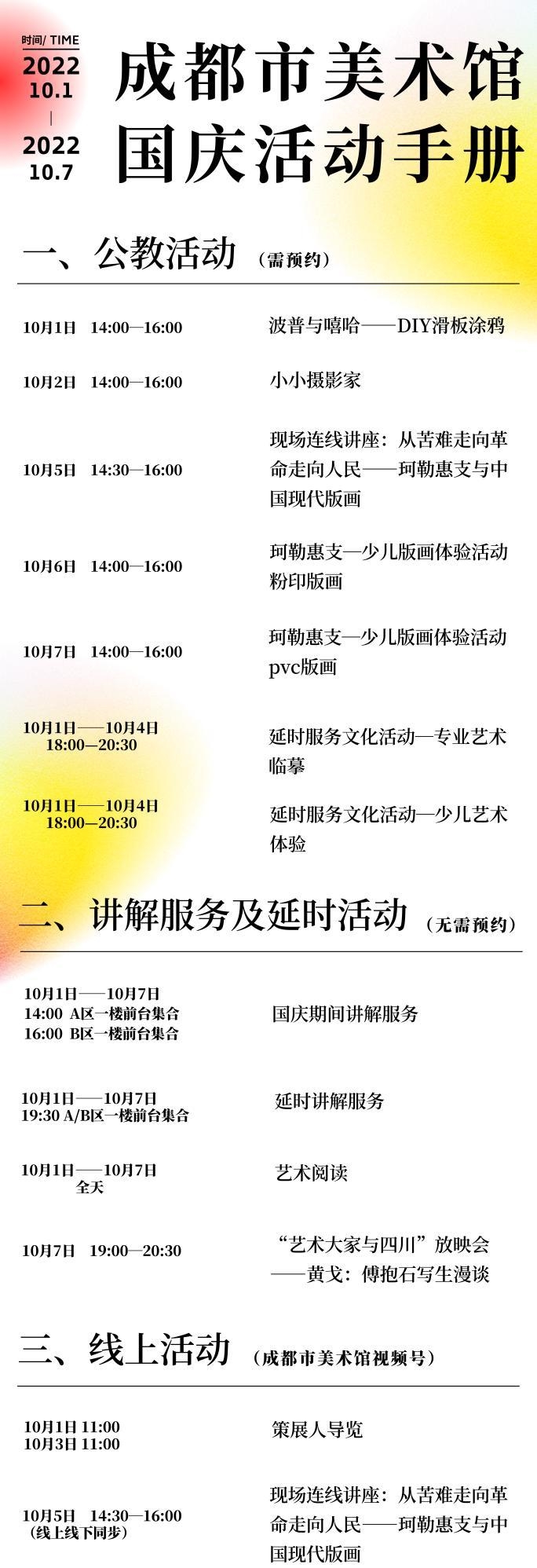 金秋十月,欢度国庆,成都市美术馆假期不打烊。记者9月30从成都市美术馆获悉,国庆期间,该馆不仅有六个艺术大展对外开放,还有连续七天超多好玩的艺术活动,包括14场线下公教、3场线上活动、28场讲解服务。同时,美术馆延时服务照旧进行,不用离蓉,在家门口就能从早到晚玩个够。