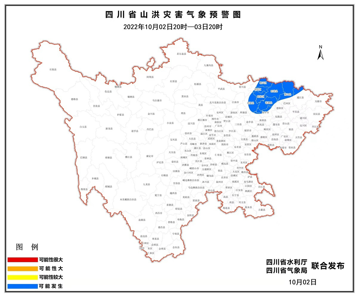 10月2日17时,四川省水利厅、四川省气象局联合发布山洪灾害蓝色预警,范围集中在川东北地区。