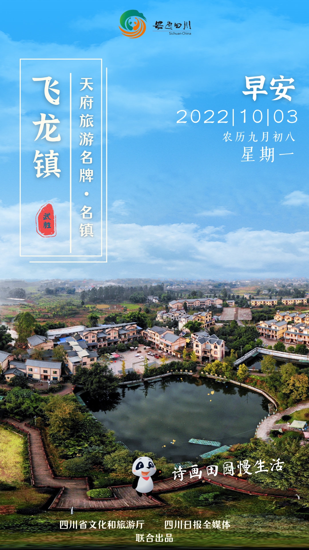 10月3日,国庆大假继续,古镇游、乡村游成为热点。今日天府旅游名牌日历海报,推荐天府旅游名镇广安武胜飞龙镇,感受诗画田园慢生活。