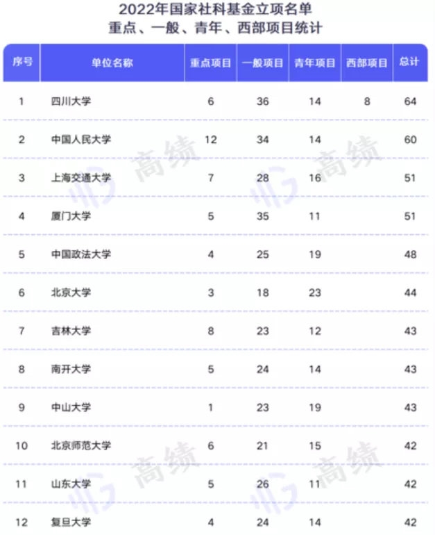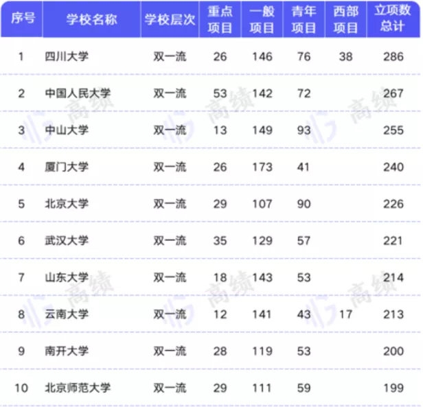 自2017年以来,四川大学国家社科基金面上项目立项数有4年居全国高校第一,近五年总数286项,居于全国高校第一。