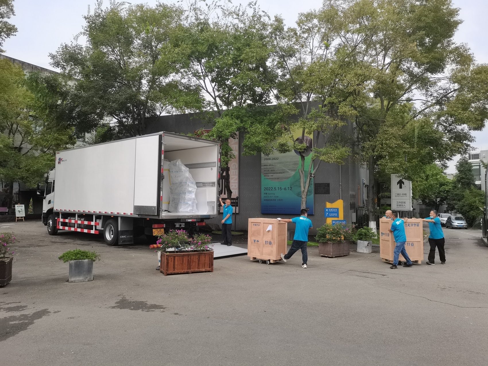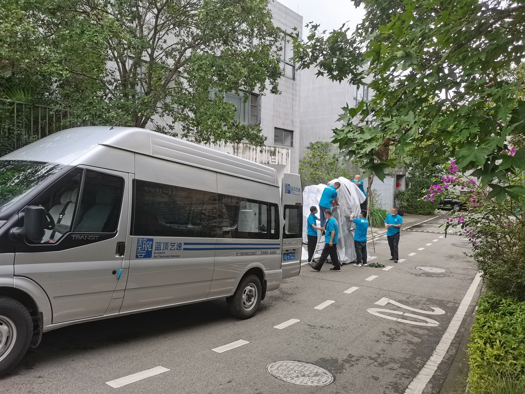 蓝顶艺速工作人员用专用气垫卡车运输艺术品