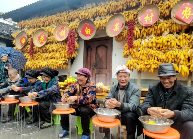越西县梅花镇白果村,村民玉米喜获丰收后举行掰玉米粒比赛。陈坤 摄