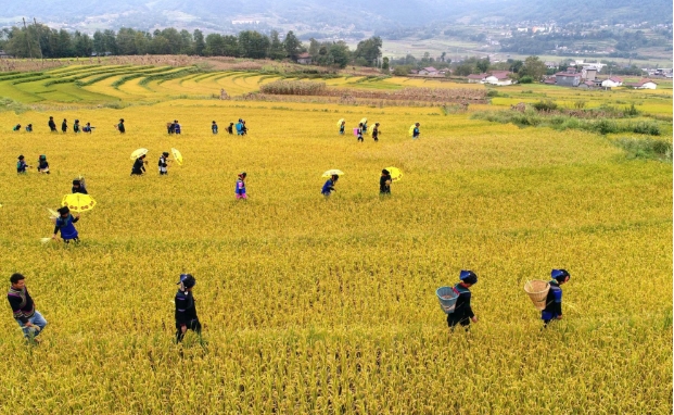 饱满的稻谷压弯了枝头,金灿灿的稻穗覆盖在梯田上;成串的玉米棒子挂上村民的房檐,金灿灿的玉米妆点着小院;红彤彤的苹果挂满枝头…… 近日,凉山州越西县各乡镇纷纷举办集农特产品展示、趣味赛事等于一体的丰收庆祝活动。