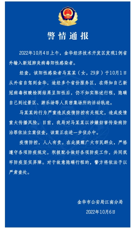 近日,浙江省金华市公安局江南分局通报:2022年10月4日上午,金华经济技术开发区发现1例省外输入新冠肺炎病毒阳性感染者。经查,该阳性感染者马某某(女,29岁)于10月1日从外省自驾到金华,途经多个省份服务区,在得知自己新冠病毒核酸检测结果呈阳性后,仍不如实陈述行程,隐瞒自己到过景区、游乐场等人员密集场所的活动轨迹。