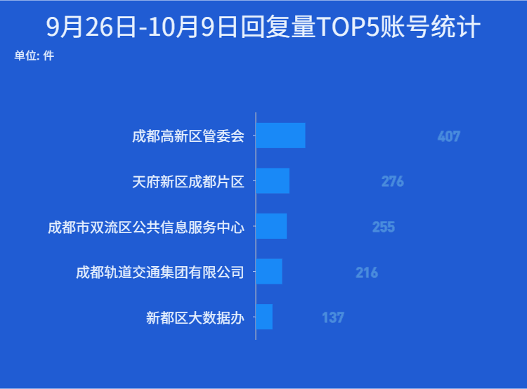 从具体接件办理单位来看,全川回复量排名前五的账号分别为: