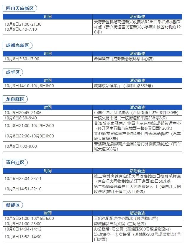 近期新增感染者在蓉轨迹现公布如下,如与以下活动轨迹有重叠,立即向社区和单位(或居住的酒店)报备,三天内接受三次核酸检测(间隔24小时),期间做好个人防护,不聚会、不聚餐。如有疑问,请拨打12345咨询。