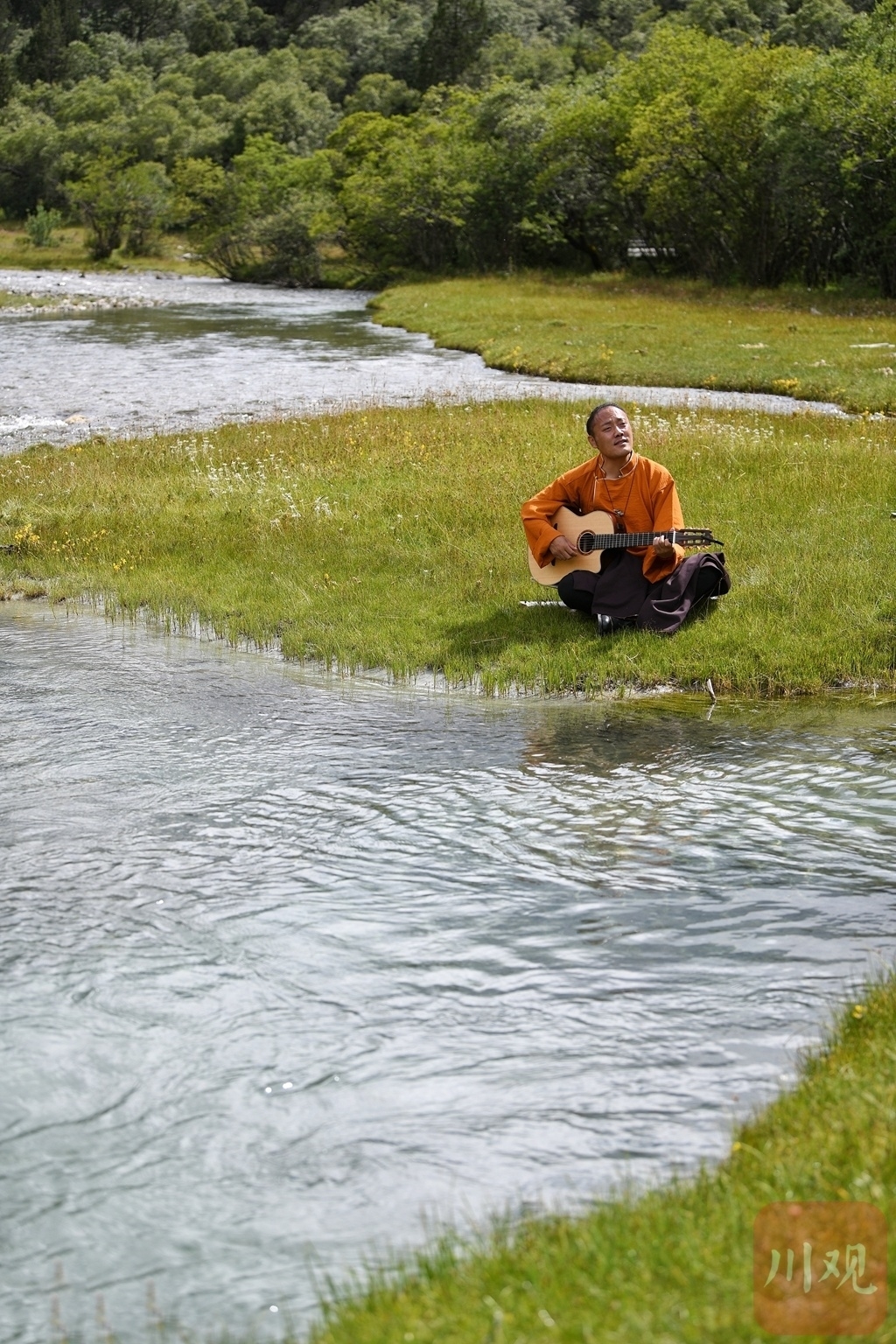 在此次全新上线的MV里,索朗达吉怀抱木吉他,自由自在地坐在巍峨雄奇的央迈勇神山脚下,伴着微风轻抚的五彩风马,伴着鸟语虫鸣的潺潺小溪,让悠扬的旋律从指尖缓缓流淌,将香格里拉娓娓唱给寻找它的人们听。
