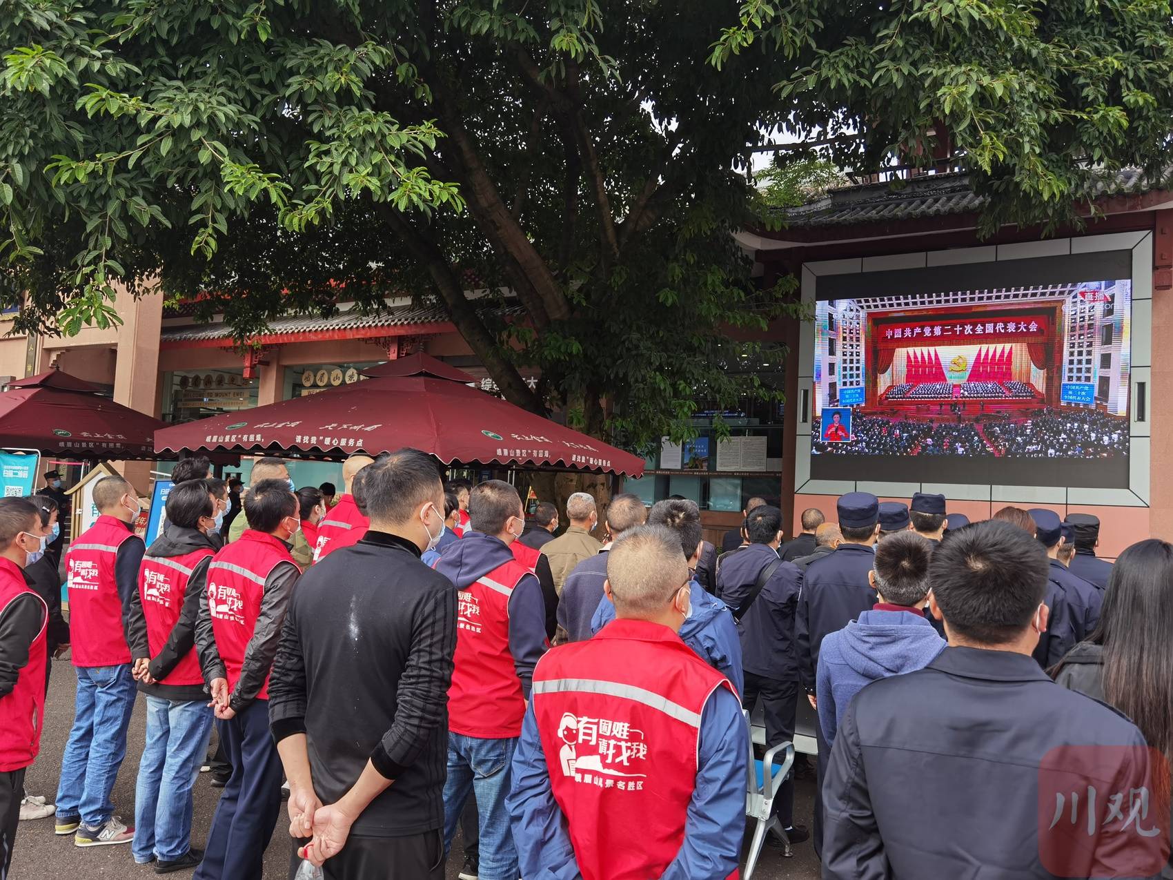 10月16日上午10时,中国共产党第二十次全国代表大会在北京隆重开幕。在位于峨眉山麓的峨眉山景区黄湾游客中心,景区干部群众和附近社区居民通过户外大屏认真收看党的二十大开幕会盛况。