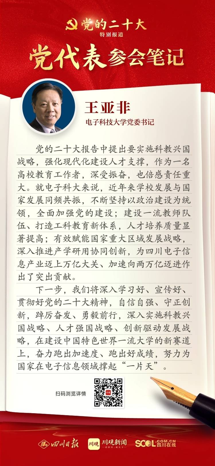 出席盛会,来自四川的党代表深感使命光荣、责任重大,大家认真履职,结合报告谈认识、谈体会、谈打算。川观新闻特此推出“党代表参会笔记”栏目,分享党代表们的参会心得,敬请垂注。