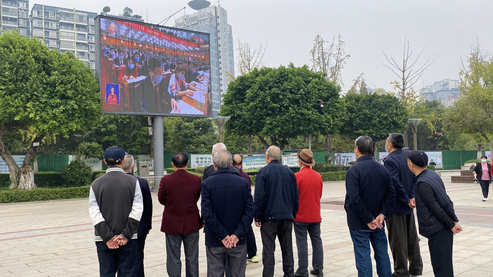 10月16日上午,中国共产党第二十次全国代表大会在北京开幕。在四川达州主城区,人民广场、中心广场、仙鹤广场等地总共8块户外大屏电视直播开幕会盛况。大屏幕前,不少市民聚集观看,共同见证这一盛会。
